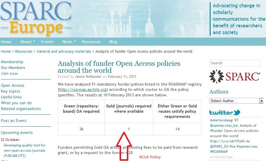 It is only now, with its flawed BIS/Finch/RCUK Gold-Preferential policy that the UK has lost its worldwide lead: In fact, as shown by the SPARC Europe Table, all other countries are now following the path that the UK pioneered in 2003-2004: the only country not following the UK's historic lead now is the UK itself!